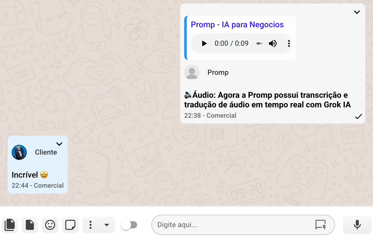 * Integração com IA Groq Cloud para tradução e transcrição de mensagens de áudio, permitindo entender e responder clientes que falam idiomas diferentes ou em áudios.